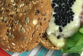 Se monta la hamburguesa con la lechuga o canónigos, la carne, la crema de queso y, por último las perlas de trufa. Se come de inmediato.