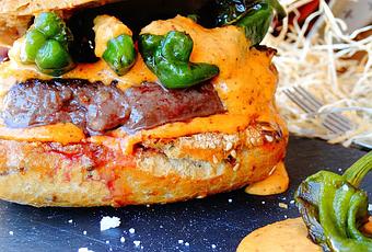 Partir el panecillo por la mitad, tostar, en la base poner un poco de salsa romesco, encima la hamburguesa, los pimientos de Padrón y un poco más de salsa.