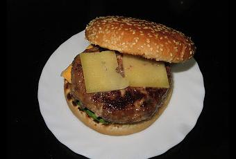 Luego echamos aceite en una sartén o plancha y colocamos las hamburguesas para cocinarlas por cada lado. Mientras tanto tostamos el pan y cortamos en rodajas la cebolla, el tomate y en láminas el aguacate. Colocamos todo encima del pan junto con la loncha de queso cheddar.