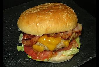 - Dos hamburguesas muy finas de unos 100 gramos, mitad ternera, mitad cerdo.