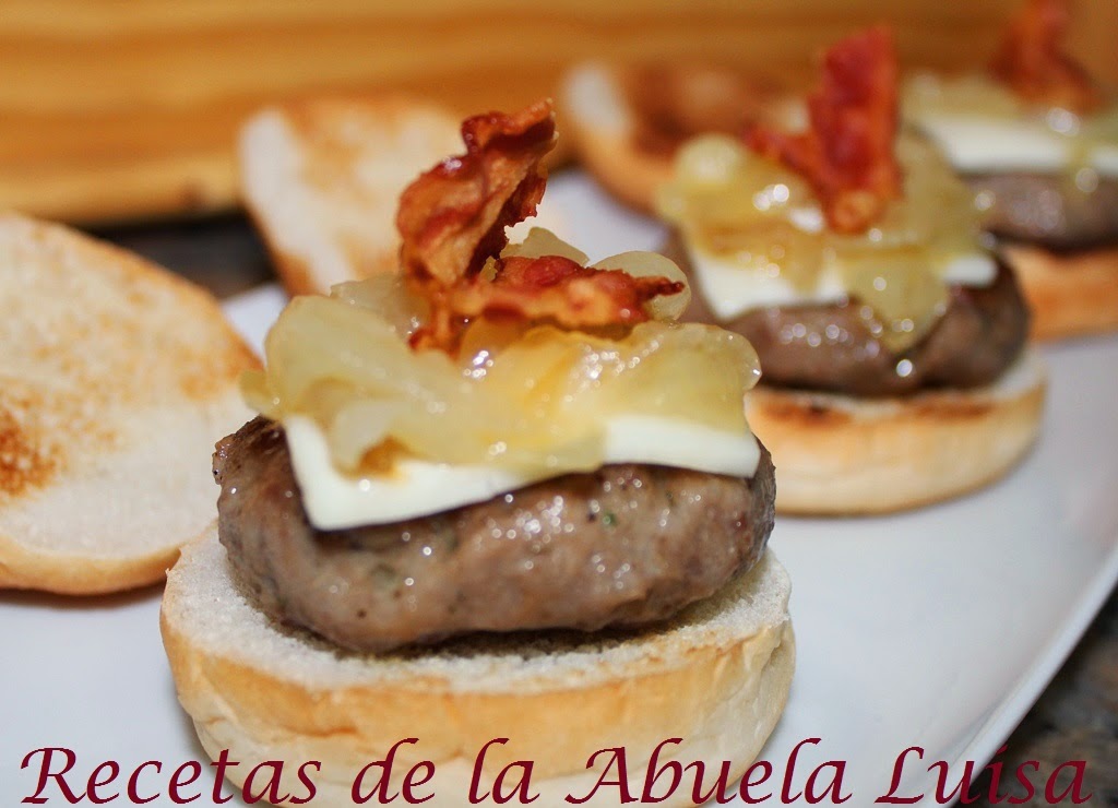 - Batimos el huevo en un bol, añadimos la carne picada, el ajo finamente picado, el pan rallado, la harina, el perejil, la sal y la pimienta al gusto, mezclamos todo bien. - Tapamos con film transparente y dejamos reposar en el frigorífico mínimo una hora. - Pelamos y cortamos la cebolla en juliana fina, la rehogamos a fuego flojo con un poco de sal hasta que esté bien blanda y un poco dorada (tardará unos 30-40 minutos). - Vamos cortando el queso en lonchas finas. - Preparamos el crujiente de bacon. - Damos forma a las hamburguesas (podemos hacerlas del tamaño y grosor que nos guste, en el caso de la foto del encabezamiento son mini) y las freímos en una sartén o plancha con unas gotas de aceite. - Entretanto partimos por la mitad y tostamos un poco el panecillo de la hamburguesa por la parte de dentro (yo lo hago en la tostadora, también se puede hacer en una plancha). - Ya solo queda montar la hamburguesa e hincarle el diente rapidito que no se enfríe.