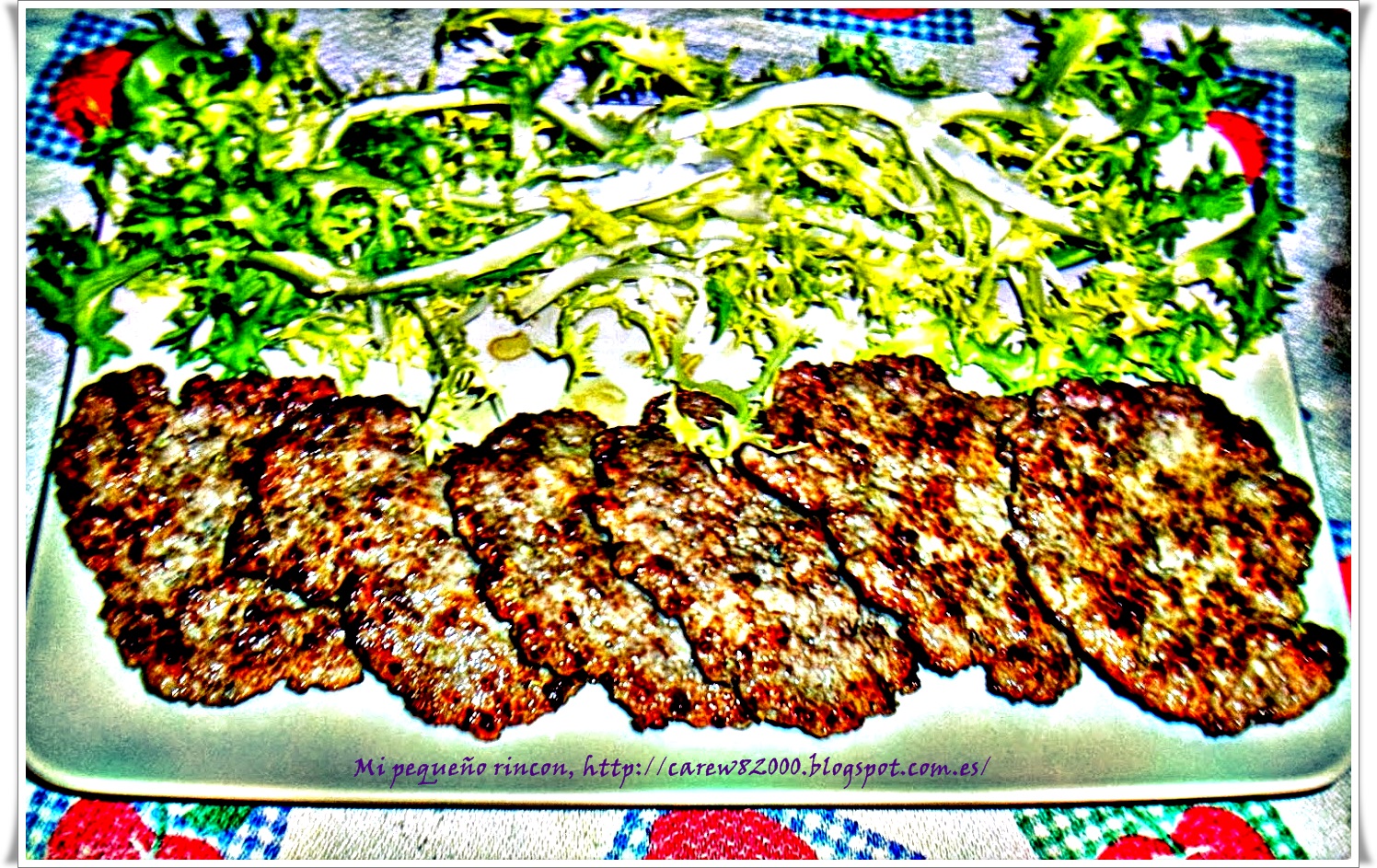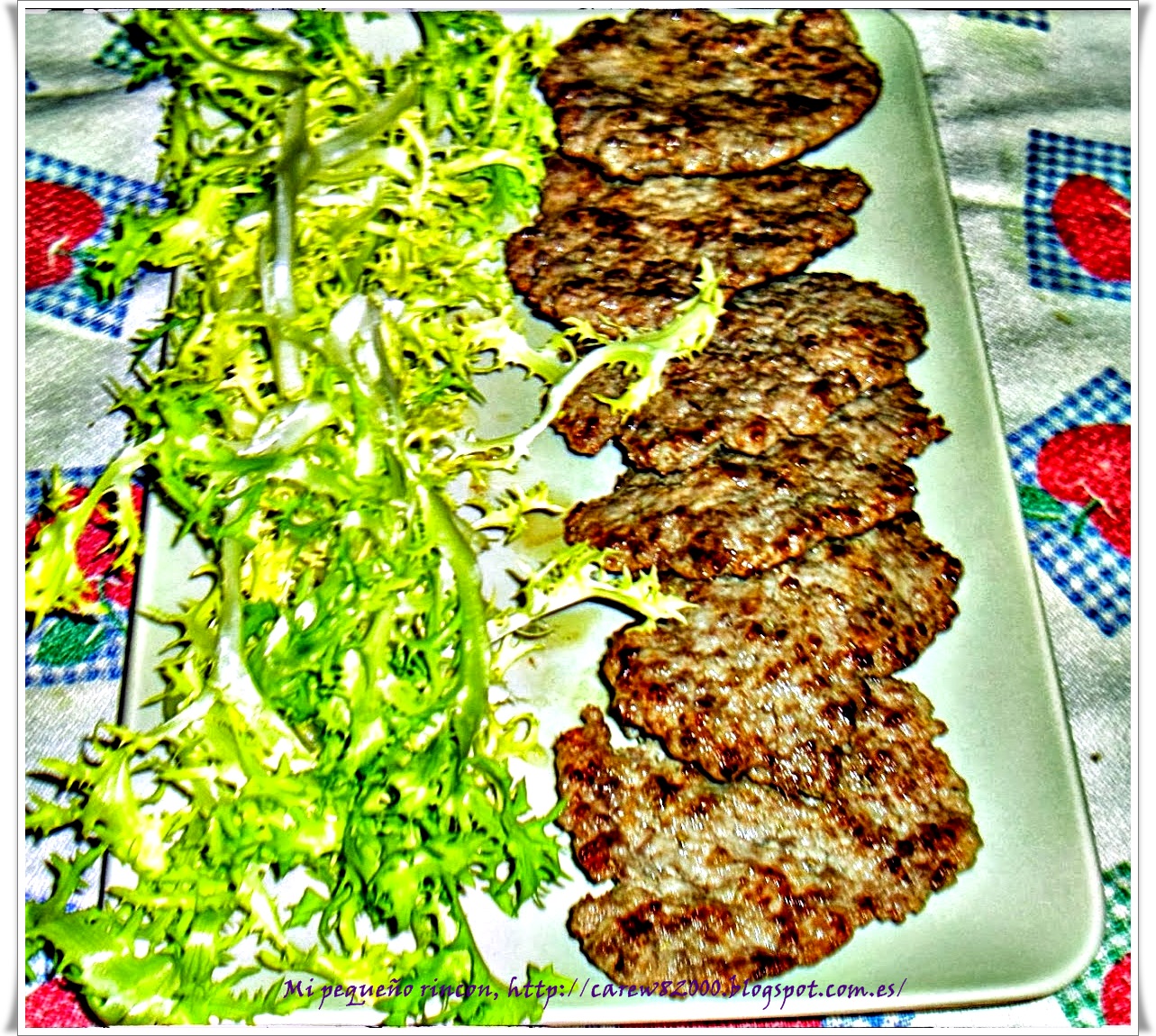 Colocamos una sartén al fuego con unas cucharadas de aceite y esperamos hasta que el aceite este bien caliente y a continuación vamos friendo nuestras hamburguesas teniendo en cuenta que contra más jugosas las dejemos por dentro mejor están, aunque al ser finas se harán enseguida.Las colocamos en un plato acompañada de la escarola que será nuestra ensalada, espero que os gusten. Receta realizada con el menaje de hosteleria Supreminox en Villasar de Mar (Barcelona).