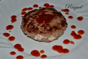 Carne picada de ternera y cerdoQueso de cabraSalPimientaPreparación:Echamos la carne picada en un bol y le ponemos sal y pimienta, lo mezclamos bien.Cogemos y ponemos sobre un papel vegetal, una base de carne picada y encima lonchas de queso de cabra y terminamos con otra base de carne picada, lo aplastamos bien.Y con un aro de emplatar vamos haciendo círculos y ya están listas para freír.