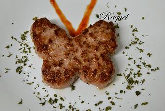 Un quarto de carne de cerdoUn quarto de carne de terneraSalPerejilAceite de olivaPreparación:Mezclamos los dos tipos de carne picada con la sal y repartimos en tres partes iguales.Ponemos un papel vegetal sobre el mármol y rellenamos el molde de mariposa con la carne picada.