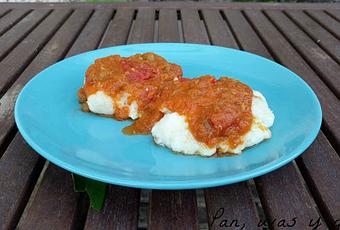 Retiramos el aceite de la sartén y hacemos un sofrito con la cebolla, el diente de ajo que nos quedaba, el tomate y la sal. Cuando la cebolla esté tierna trituramos todo con la batidora y cubrimos la merluza con esta salsa. Añadimos los pimientos cortados en tiras, los guisantes y la sidra.