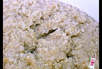 Lavar bien la quinoa. Yo la pongo en una olla con agua, la remuevo varias veces y la cuelo. Repito este proceso unas 8 veces, hasta que el agua queda limpia. Cocinar con el doble de agua durante 15/20 minutos, hasta que absorba el líquido.