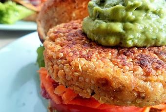 ♥ 100g de quinoa♥ 200g de garbanzos cocidos♥ 25g de soja texturizada♥ 1 diente de ajo♥ ¼ cucharadita de pimienta♥ 1 cucharadita de pimentón dulce♥ 1 cucharadita de comino molido♥ 1 cucharadita de tomillo♥ 1 cucharadita de mostaza dulce♥ 2 cucharadas de maizena o fécula de maíz♥ 2 cucharadas de pan rallado♥ 1 cucharadita de sal♥ pan multicereales o integral o pan de hamburguesa♥ lechuga♥ berenjena asada♥ tomate♥ cebolla asada♥ zanahoria rallada♥ mostaza dulce♥ aguacate