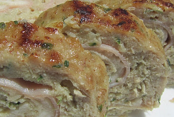 3- Engrasar 5 trozos de film, y poner en cada uno, 2 cucharadas de la carne, colocar otro film encima y aplastar con la mano, darle forma rectangular, es muy sencillo sin mancharnos con el film. Quitar el film de arriba. Colocar una loncha de jamón y queso encima de la carne, y ayudándonos con el film ir enrollando, al terminar, por el extremo donde se termina el rollo, enrolláis al contrario haciendo un rulo de carne. Giráis los extremos y listas.