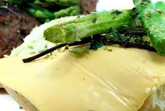 Paso 4. Finalmente sólo nos resta montar ya nuestras hamburguesas gourmet, en una mitad del pan de Viena añadiremos las dos mini hamburguesas caseras y dos espárragos trigueros cortados por la mitad. La otra mitad del pan de Viena la cubriremos con una loncha de queso cheddar, dos mitades de espárragos trigueros y el cilantro en rama.