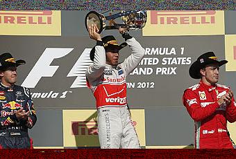 “Ganaremos, perderemos, pero como siempre no nos vamos a rendir hasta la bandera a cuadros”, advirtió Alonso, convencido de que puede dar la sorpresa el último día en Brasil, como hizo el propio Vettel en Abu Dabi en 2010, cuando ganó la carrera su primer Mundial siendo el aspirante que peor lo tenía –Alonso fue séptimo y Webber octavo en aquella cita–, o en 2007, cuando Kimi Raikkonen se llevó la corona, también tras ganar la carrera, en este caso en Interlagos, y de que Alonso fuese tercero –curiosamente, detrás de su actual compañero, Massa– y Hamilton acabó octavo. El asturiano piensa que esta vez la suerte puede cambiar a su favor -para ser campeón necesita ganar la carrera y que Vettel no pase del quinto puesto, ser segundo y que el alemán no supere la octava posición, o acabar tercero y que Vettel sea décimo o no puntúe- y se esmerará al máximo para que así sea y asegurar el segundo puesto en el Mundial de constructores. El primer puesto, por tercer año consecutiva, es para Red Bull, por más que Webber no puntuase.Micrófono en mano, Vettel recordó que su debut en la Fórmula 1 fue en Estados Unidos hace 5 años conduciendo un BMW sustituyendo a Robert Kubica, que había tenido un grave accidente en Canadá. Mientras el piloto de Red Bull relataba sus inicios en el Gran Circo, Hamilton y Alonso hablaban en el podio y sonreían. Para el británico, el último en ganar en Estados Unidos –lo hizo en Indianápolis en 2007 y que igualó las 21 victorias de Mika Hakkinen– era una jornada especial: “Estoy muy orgulloso. Hacía tiempo que no ganaba”. Y para el asturiano la continuación de un sueño, el tercer Mundial: “Perder tres puntos con Sebastian en un fin de semana en el que ellos volaban es para estar contentos”. El asturiano volvió a ser infalible y en la salida se merendó a Nico Hulkenberg, a Michael Schumacher y a Raikkonen, y vio cómo los tres primeros se escapaban sin remedios. A Hamilton no le costó en exceso superar a Webber, que tuvo que abandonar de nuevo –vuelta 17– y Alonso se colocó tercero, una posición que ya no perdería a pesar de que su pit stop fue uno de los más lentos (6'3 segundos) y de que le pasase Jenson Button cuando éste, el único junto con Nico Rosberg en partir con gomas duras, todavía no había hecho la parada en boxes.