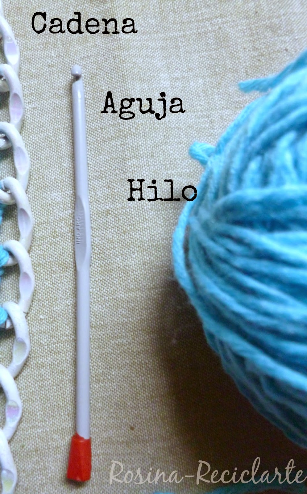 Usé un trozo de cadena blanca(que vaya a saber uno de donde saqué),e hilo gruesito..