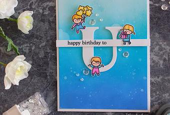 Para el fondo he usado tintas Distress Oxide y unas gotas de agua. He troquelado la letra U del set "Big U" de Simon; el sentimiento es del set de sellos "You matter". Los niños y la niña pertenecen a los sets "Little Boy Agenda" y "Little Girl Agenda" de Mama Elephant. Los he coloreado con lápices de colores y recortado con tijeras.