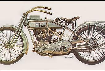 La ilustración, de Bruno Belli, nos muestra a una Harley-Davidson 11F del año 1915. Se aprecia el motor bicilíndrico en V de 45º longitudinal con una cilindrada de 989 centímetros cúbicos y una potencia de 11 HP. Tenía tres velocidades de accionamiento manual, con pedal de freno, que solo accionaba la rueda trasera, con suspensión rígida.