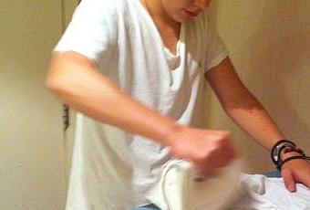 El complemento gracioso es que el joven se muestra planchando una ropa interior de color blanco con mucha concentración.