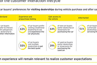 Si bien el uso de canales en línea como complemento de los canales fuera de línea ahora es la norma, la experiencia en persona sigue siendo importante durante todo el viaje del cliente. Los compradores buscan una primera experiencia digital, pero que ofrezca la comodidad de estar en línea con la seguridad de la interacción personal con el personal experto del distribuidor. Más del 60 % de todos los compradores de automóviles, independientemente de la elección de la cadena de transmisión, prefieren visitar a un concesionario para las etapas previas a la compra y de compra: el 63 % prefiere una interacción con el concesionario para recopilar información, y la misma proporción prefiere que un concesionario experimente el automóvil físicamente. El 64% de los compradores de automóviles nuevos prefieren comprar en un concesionario en lugar de hacerlo en línea.