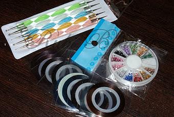 Como veis, son unos punteros (O dotting tools) para hacer círculos, coger decoraciones etc, unos brillantitos pequeños y redondos de colores variados y unas cintas adhesivas (Stripes) para hacer diseños de líneas. MAQUILLALIA