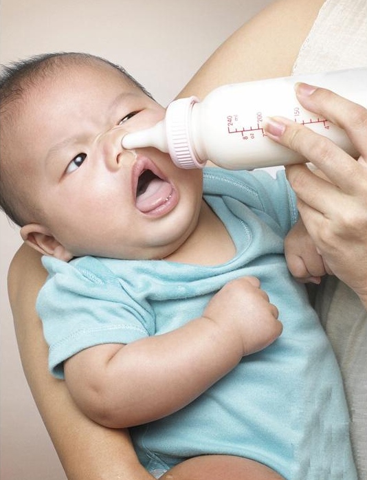 niño tomando el biberon con madre despistada