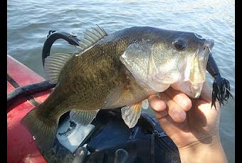 Tras un gran parón de actividad, a eso de las 6 de la tardeveo como mi línea se desplaza hacia la derecha despacito y al clavar se partela línea, ni sentí el peso del pez con lo que pensé que se trataba de un lucio,pero de repente veo venir hacia mí un bass que rondaría el kilo y medio de pesocon mi jig “Tenax” en la boca y selía a pegar brincos para deshacerse de él. Esto me preocupa porque llevaba un0,35mm de fluorocarbono P-Line que no parte asícomo así. Reviso la línea y veo que no está dañada ni nada y anudo con un nudopalomar un jig “Model I” de Keitech con el cual al primer lancenoto una picada y me vuelve a pasar lo mismo con lo que ya me quedo “flipao”. Vuelvo a anudar un “Kento”, reviso la línea y la estirotodo lo fuerte que puedo para ver si se vuelve a romper y aguantó.