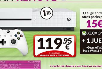 Con una Xbox One de 1 TB con mando serán 79,95 euros y finalmente si te deshaces de la Wii U con el gamepad se queda en 118,95 euros. Además pagando 15 euros más podrás hacerte con FIFA 17, Gears of War 4 o Halo Wars 2 en forma de pack.