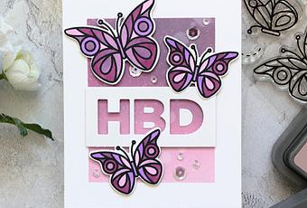 Para hacer esta tarjeta he enmascarado un rectángulo en el medio de la tarjeta base y lo he coloreado con tintas Distress Oxide (Dusty Concord, Seedless Preserves y Milled Lavender). También he troquelado el troquel "HBD" y lo he dejado a un lado mientras coloreaba las mariposas. He usado los troqueles coordinados para cortar las mariposas una vez listas y después he pegado todo en la tarjeta con cuadrados de espuma. Unas lentejuelas le han dado el toque final a la tarjeta.