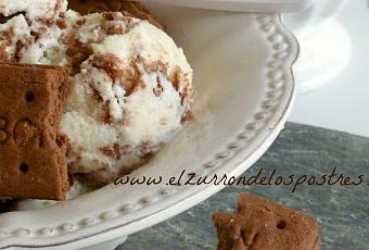 INGREDIENTESCrema: 250 ml de leche entera, 2 yemas de huevo L, 1 cucharada de maicena, 60 gr de azúcar, ½ vaina de vainilla, corteza de naranja, ½ cucharadita de cremor tártaro, 50 gr de nata líquida y 1 cucharada de brandy (opcional).250 ml de nata para montar y 45 gr de azúcar.100 gr de galletas Bourbon molidas.Decoración: galletas Bourbon troceadas.PREPARACIÓNEn un bol ponemos los 50 gr de nata líquida con el cremor tártaro. Dejamos en la nevera.En un cazo ponemos 200 ml de leche con la corteza de naranja y la vaina de vainilla. Dejamos que hierva un poquito y dejamos reposar.En un bol ponemos el resto de la leche, la maicena y el azúcar. Revolvemos hasta que se deshaga. Le añadimos las yemas y mezclamos, le incorporamos la leche con los aromas. Pasamos de nuevo todo al cazo colándolo. Ponemos a fuego medio hasta que la crema nape la cuchara, no debe hervir. Inmediatamente después vertemos la crema en el bol con la nata líquida, revolvemos y dejamos enfriar. Una vez fría le ponemos el brandy.Montamos la nata con el azúcar y mezclamos con cuidado la crema. Llevamos al congelador, cuando haya pasado una hora revolvemos para deshacer los cristales de hielo. Esto lo haremos a cada rato, dos o tres veces más.En un recipiente ponemos cucharadas de helado en el fondo, cubrimos con cucharadas de galletas molidas y volvemos a poner más helado y más galleta, así hasta terminar. Llevamos al congelador y dejamos hasta que esté totalmente congelado.