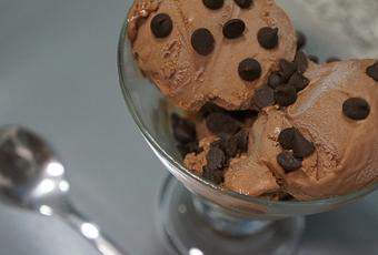 En primer lugar, separe las yemas de los huevos, échelas en un bol para batir junto con la cucharadita de azúcar avainillado, bátalo bien hasta que vea que se ha creado una mezcla espumosa y luego sin dejar de batir vaya añadiendo poco a poco los 75 gramos de azúcar blanco hasta obtener una mezcla homogénea. A continuación ponga a calentar los 125 mililitros de leche entera en un cazo a fuego medio hasta que hierva, luego vaya echando poco a poco la mezcla de las yemas con el azúcar sin dejar de remover hasta que vea que la mezcla se haya espesado y retírela del fuego. Funda el chocolate negro al baño maría junto con 3 cucharadas de nata y una vez fundido añada 1 cucharadita de cacao el polvo y remueva sin parar hasta que este se haya disuelto. Saque el chocolate negro del fuego y añada la mezcla que ha preparado anteriormente, luego mézclelo todo y una vez bien mezclado déjelo enfriar durante 30 minutos. Una vez pasado 30 minutos monte los 175 mililitros de nata con unas varillas batiendo enérgicamente o con una batidora de repostería a velocidad máxima, para ello es importante que la nata este muy fría por lo que la pasaremos del frigorífico al congelador 15 minutos antes de montarla. Una vez montada la nata, añádala al chocolate y mézclela bien con movimientos envolventes hasta que consiga una mezcla homogénea. A continuación eche la mezcla en una heladera durante aproximadamente 30 minutos o en el caso de no tener heladera meta la mezcla en el congelador durante 6 horas. Una vez ya congelado el helado, sírvalo en una copa junto con unas cuantas pepitas de chocolate.