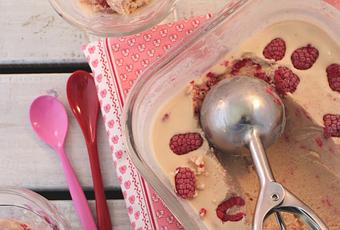 Transcurrido el tiempo de mantecado, volcamos la crema en un recipiente de cristal con tapa, adornamos con el resto de frambuesas e introducimos el recipiente en el congelador toda la noche.