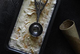 Put peach ice cream base into ice cream maker and churn for about 25-30 minutes. Add the reserved chunks of peach during the last 30 seconds. Transfer to a container and cover with cling film. Freeze for at least 4 hours or until serving it.