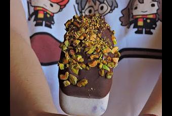 Bañamos los helados y rebozados en pistachos tostados picados a cuchillo.
