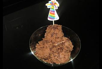 Una vez pasado el tiempo, lo echamos en un recipiente apto para el congelador y lo metemos. Si no tenéis heladera debéis darle vueltas para que el helado no se cristalice. Cuando queráis consumirlo, lo sacáis unos minutos antes del congelador y lo decoráis como más os guste, en este caso con fideos de chocolate.