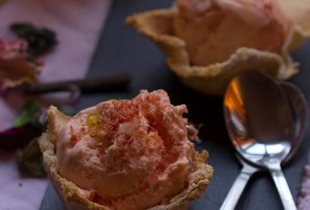 Helado de tomate con aceite y sal de jamón sobre tulipa de pan de molde
