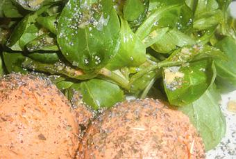 Preparamos la ensalada poniendo los canónigos y añadiendo por encima nueces picadas y sal maldon.