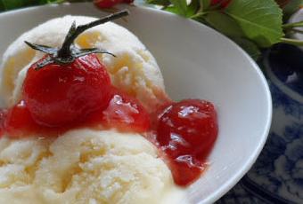 HELADO DE TRES QUESOS Y TOMATES CHERRY A LA VAINILLA