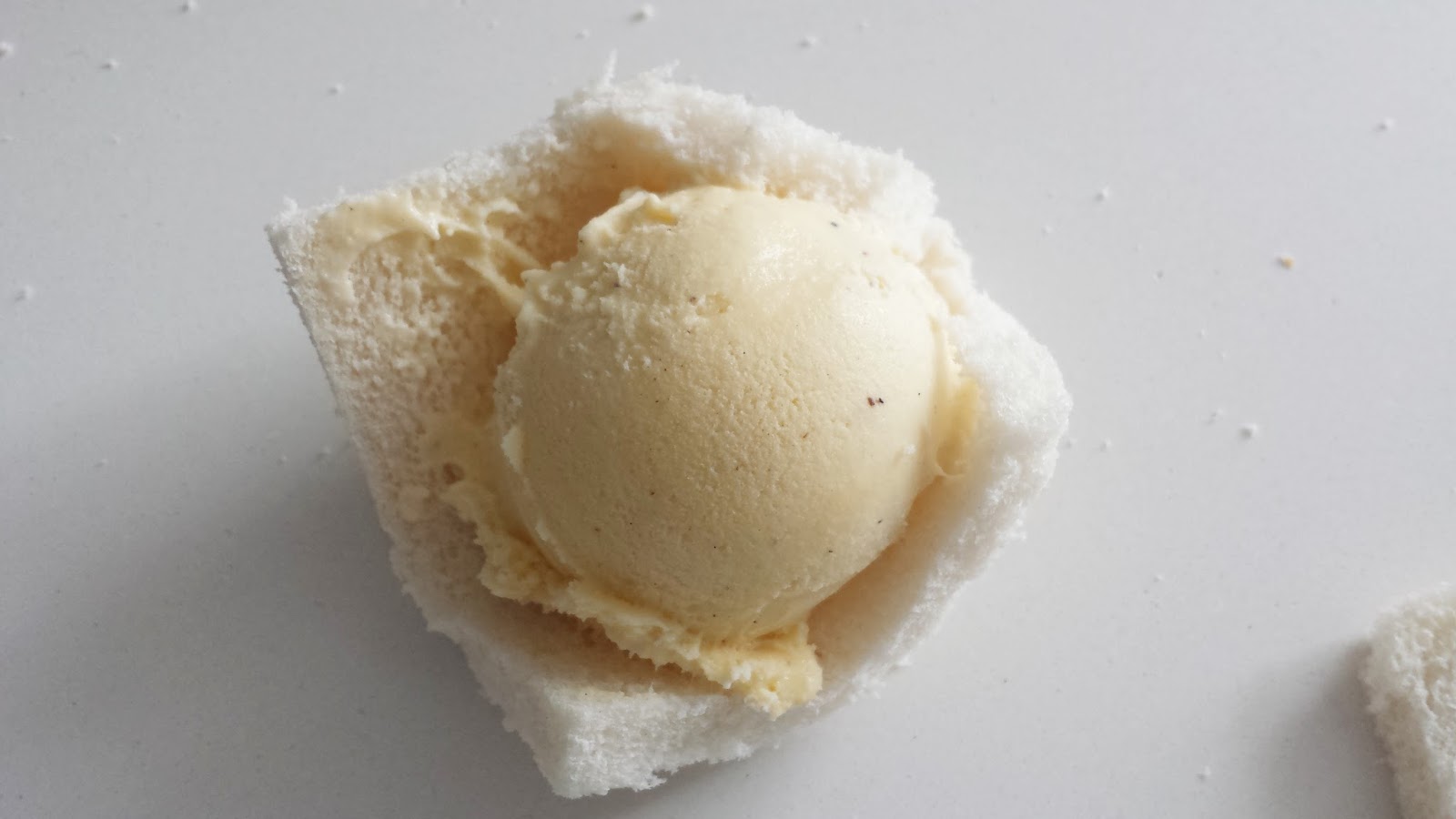 2. - Con un "sacabolas" sacamos una bola de helado y la ponemos sobre una rebanada de pan.