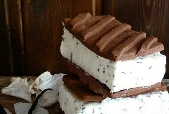 INGREDIENTESMasa de galleta: 1 huevo pequeño, 200 gr de harina, 15 gr de cacao puro en polvo, unas gotas de extracto de vainilla, 60 gr de azúcar glas y 80 gr de mantequilla.Helado: 250 gr de nata, 80 gr de azúcar, 20 gr de miel, una pizca de cremor tártaro (opcional), unas gotas de extracto de vainilla y 2 cucharadas de fideos de chocolate.PREPARACIÓNHacemos el helado: montamos la nata con el azúcar y la miel, le añadimos el cremor tártaro. Llevamos al congelador o si se hace a máquina, como indique el fabricante.Si se hace a mano, a la hora de estar en el congelador se bate cada 30 minutos, dos veces y en la última vez, se añaden los fideos de chocolate, se vierte en un molde rectangular forrado con papel vegetal, se tapa con el papel sobrante y se lleva de nuevo al congelador.Si se hace a máquina, una vez mantecado el helado se le añaden los fideos de chocolate y se vierte en el molde rectangular y se lleva al congelador.