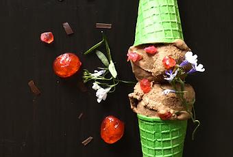 Un helado con un chocolate intenso, cerezas jugosas y suave crema, servido en un crujiente cono.