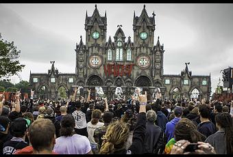 La puesta en escena no pegaba para el Hellfest, iban todos vestidos de blanco y el escenario lleno de flores...El cantante decía que nos iba a llevar al cielo... Bah!