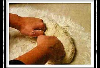 ...Una vez esponjada la masa, volver a colocarla de nuevo sobre la mesa untada con aceite; todas las manipulaciones que deberán hacerse con la masa se harán con el palote y las manos untadas de aceite en vez de harina como es corriente en pastelería y bollería; heñir la masa, sin trabajarla demasiado, y fraccionarla en trozos de 45 a 50 gramos, embadurnándolos todos con aceite...
