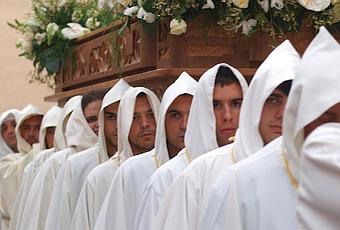 Los hermanos, sin distinción de sexo, visten una túnica de color hueso en una sola pieza, estilo cisterciense; portan un farol eléctrico. Además llevan un escapulario con el anagrama de la Hermandad colgado del cuello.Procesión