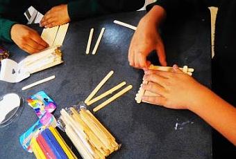 En la imagen se puede apreciar un trabajo en el que se dejó el color de la madera, uno dorado y otro en el que utilizó los palos de colores.