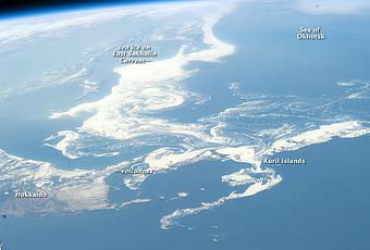 La corriente de Sakhalin gira hacia el este y transporta el hielo hacia la cadena de las Islas Kuriles. Algo de hielo puede extenderse entre las islas, mientras es llevado hacia el suroeste por la Corriente Kuriles. En 2010 , los astronautas capturaron el hielo rompiendo a través de las islas.