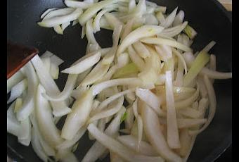Cuando comience a coger color, añadimos la zanahoria, a los 10 minutos el calabacín y lo tenemos hasta que se nos haga según nos guste (mucho o poco). No dejen de remover. Ya casi al final añadimos la sal, el ajo en polvo y hierbas (yo le añadí sólo orégano). En otra sartén, cuando la verdura esté casi hecha, vertemos un poco de aceite y lo extendemos con una servilleta de papel. Incorporamos los filetes. Se formará una especie de capa negra del líquido que soltarán pero se le quita con facilidad y mejor limpiarlos a media que vean esa capa. Aderezar por un lado con sal y estragón . Dar la vuelta cuando veamos que están bien hechos y repetir el proceso.