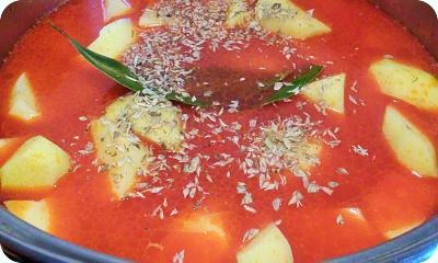 Incorporamos las patatas chascadas, el laurel, sal y orégano. Cubrimos de agua y ponemos el vinagre.