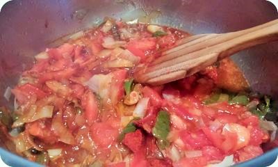Ponemos a calentar aceite en el fondo de una cacerola. Picamos el puerro, la cebolla y pimiento verde. Pochamos. Añadimos los ajos laminados. Cuando estén los ajos doraditos añadimos el tomate rayado previamente y el pimentón dulce, damos unas vueltas, y dejamos unos cinco minutos.