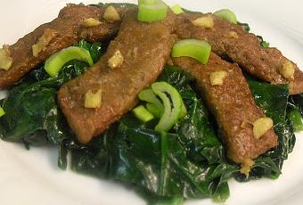 Escaldar el hígado en agua hirviendo unos segundos, para asegurar que permanezca tierno en su cocción. Escurrir, cortar en tiras o trozos un poco largos, salar y rebozar con la harina de maíz. Lavar bien, cortar y escurrir las espinacas. Calentar dos cucharadas de aceite en un wok, añadir las espinacas y la sal y rehogar durante 3-4 minutos. Retirar las espinacas del wok y reservar y mantener calientes.