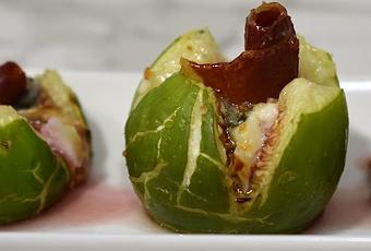 Y hacemos un rulo con un trozo pequeño de jamón y lo ponemos en el centro del higo.
