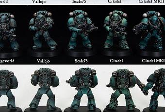 Esto lo ha colgado hoy en su cuenta de Twitter y es un retoque de algo que ya colgó hace tiempo, sobre como quedan los Hijos de Horus pre-herejía/Herejía de Horus, según la imprimación y las pinturas usadas (Usadas según marca. Lo que sale como "Citadel Mk II" supongo que se refiere a las Citadel Contrast).