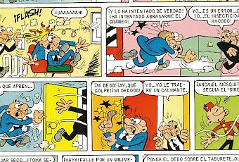 Pero tristezas aparte, la vida sigue. En mayo de 1963 el prolífico Francisco Ibáñez crea El Botones Sacarino para El DDT, donde a priori fue tan sólo una serie secundaria en la que no ocupaba más que una pequeña parte de la página. Tal y como en su día ya viéramos por aquí, el personaje de Sacarino está fuertemente basado en el personaje franco-belga Gaston Lagaffe, más conocido en España como Tomás el Gafe, que fuera creado por André Franquin en 1957. Ya que en España Gastón no era conocido durante los 70, Ibáñez aprovechó la ocasión para componer un híbrido de Spirou y Gaston, que dio como resultado al Botones Sacarino.