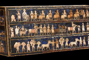 Estandarte de Ur (Siglo XXVI A.C). El objeto tiene dos caras, una de paz y otra de guerra, que ilustran la vida en una ciudad sumeria al inicio de la civilización
