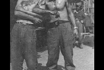 Ambos son miembros de una formación Ustacha, que en 1941 cometió crímenes indescriptibles sobre aquellos que creían indignos de vivir. Resulta irreal que alguien que mató a un hombre, una mujer o un niño, hace apenas unos minutos, pueda reírse y parecer feliz y ajeno a la atrocidad que acaban de cometer.Esta instantánea fue tomada en el campo de concentración de Jasenovac, uno de los lugares más espantosos de la historia. El principal objetivo era torturar a sus víctimas y las humillarlas de modo más horrible posible antes de asesinarlos. Al mismo tiempo, los guardias croatas del campo disfrutaron de administrar tortura.